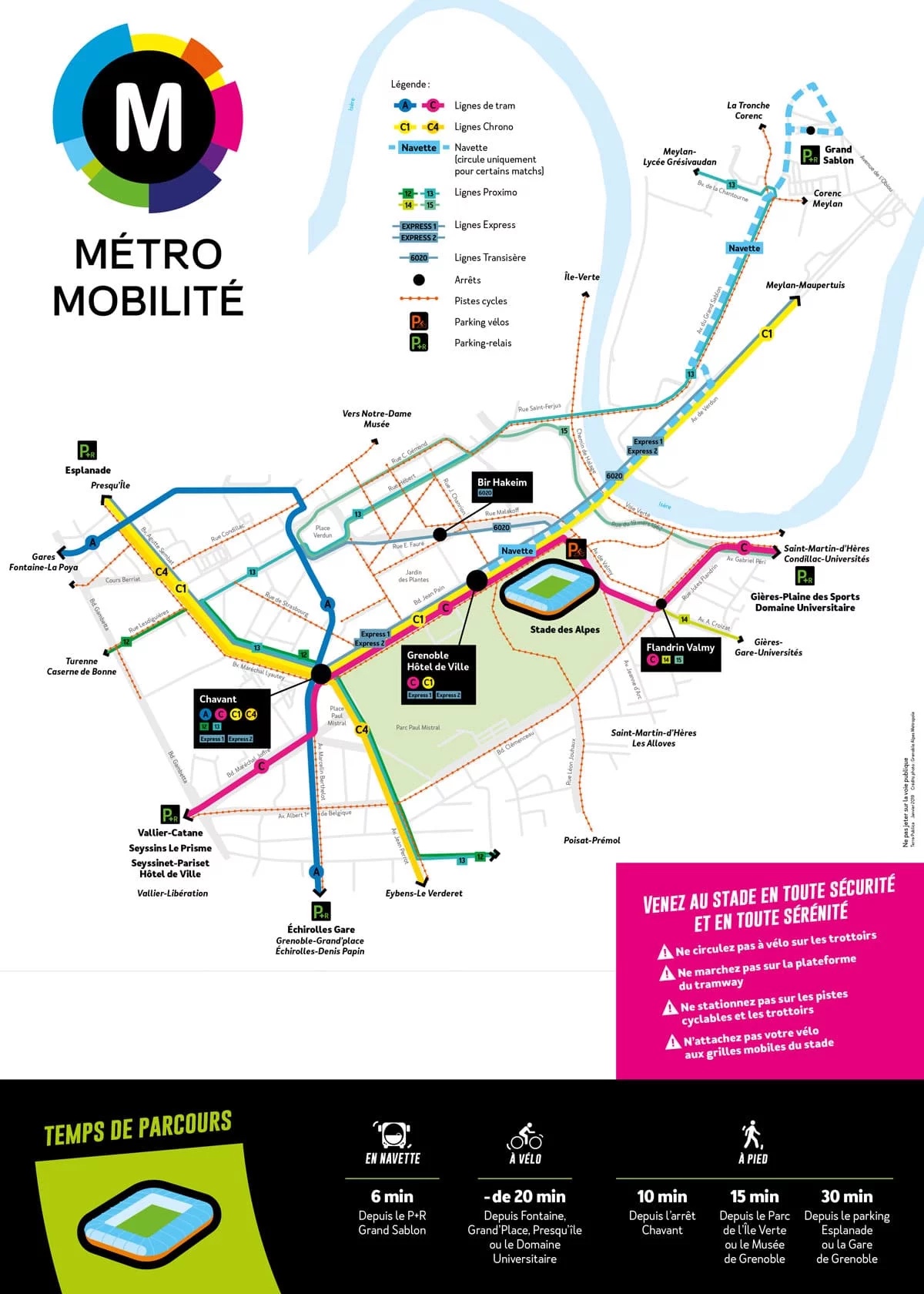 Le stade des Alpes est situé au cœur du réseau de transports en commun de l’agglomération grenobloise. Il a été conçu de manière à privilégier les déplacements « doux », à pied, à vélo, en bus, en tram, ou en combinant voiture et transports en commun grâce aux 5 parkings relais. Avec le réseau TAG, profitez d’un accès direct à tous les évènements du Stade des Alpes.